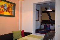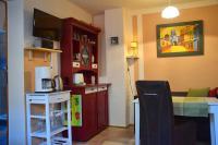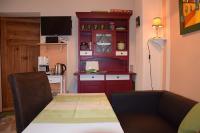 Im Wohnraum des Ferienhauses ist ein Fernseher und Radio. Der Raum ist klein aber fein. Hier befindet sich die Klimaanlage, die auch den Schlafraum mit kühlt oder heizt. Ein kleines altes Küchenbüffet erstrahlt im neuen Glanz.